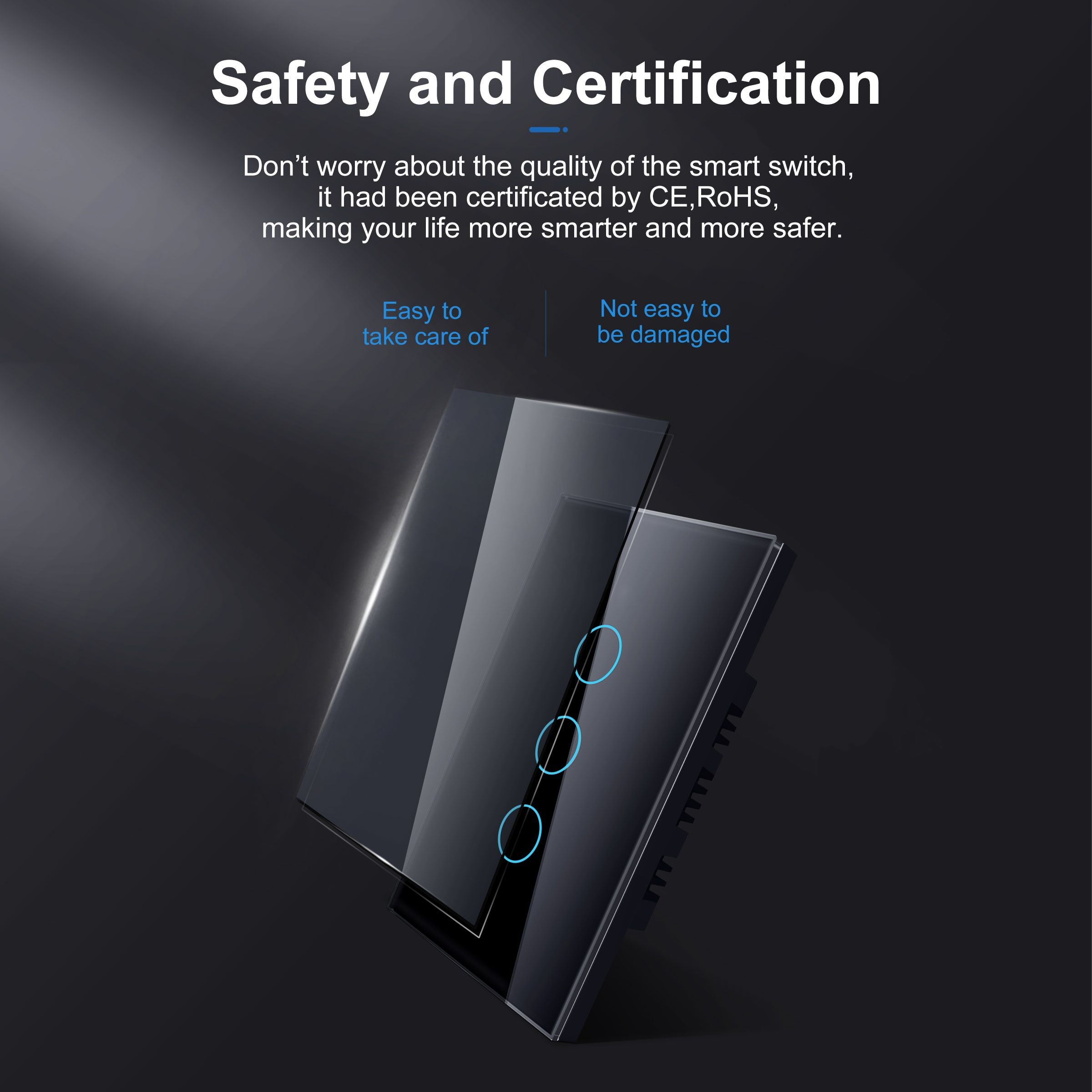 The wall switch adopts premium materials, such as fire-resistant shell, phosphor bronze connects and advanced PC+TEMPERED GLASS, can provide fire prevention, overload protection to protect your family. Our all products certificated by CE, FCC, and RoHS. Without using any harmful chemical substances, please fell relived about usage.